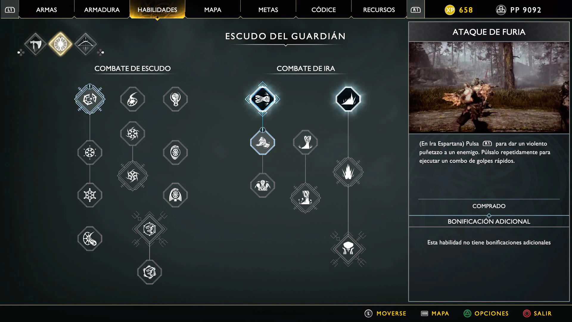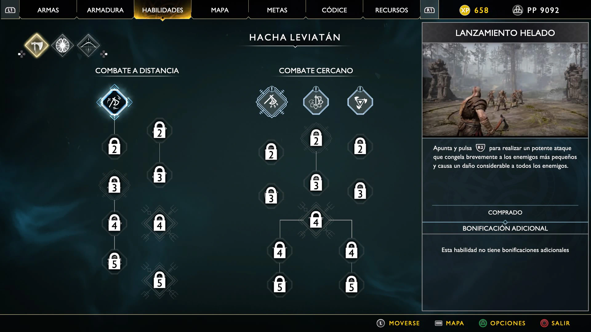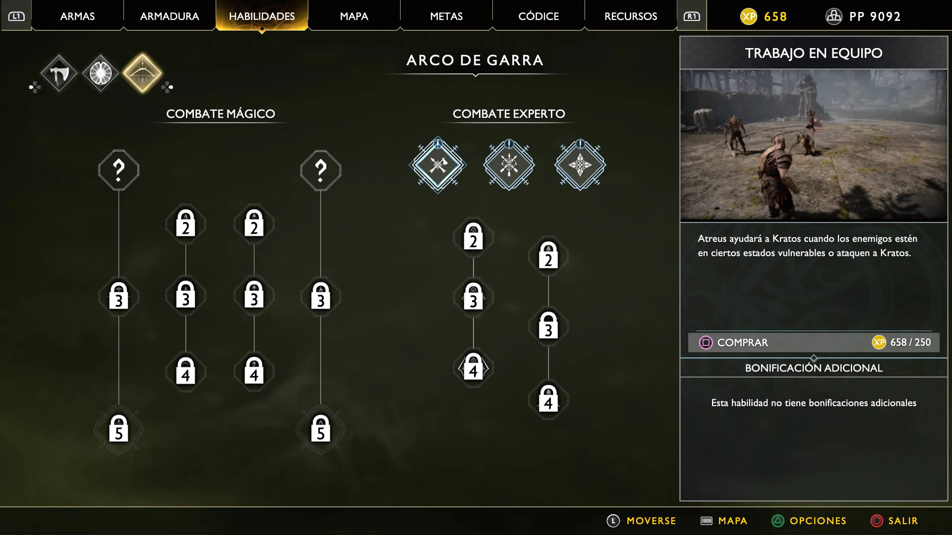 Las habilidades están organizadas en un árbol de habilidades que se desbloquean consiguiendo cierto nivel en el arma y experiencia, las nuevas habilidades hace más poderosos algunos golpes o permiten nuevas formas de golpear a los enemigos, esta progresión permite ir aprendiendo poco a poco que hace cada nueva habilidad. La experiencia conseguida durante el juego es más que suficiente para desbloquear todas las habilidades de los diferentes árboles de habilidades tanto de Kratos como de Atreus. El hacha, el escudo, las espadas y el propio Atreus tienen su propio árbol de habilidades.