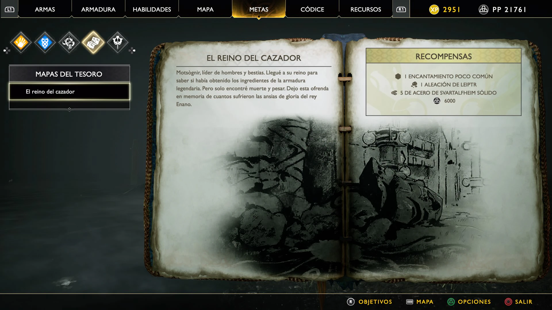Los mapas del tesoro ofrecen una descripción y una imagen que hay que reconocer para saber donde está enterrado, encontrarlo proporciona algunos recursos para mejorar el equipo.