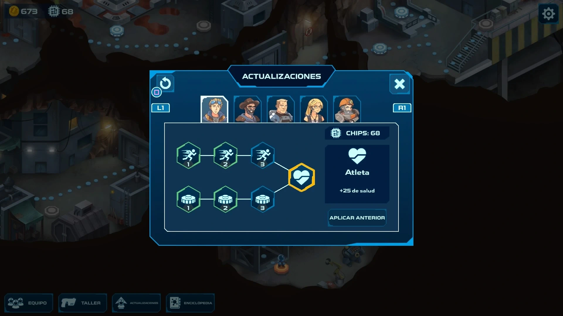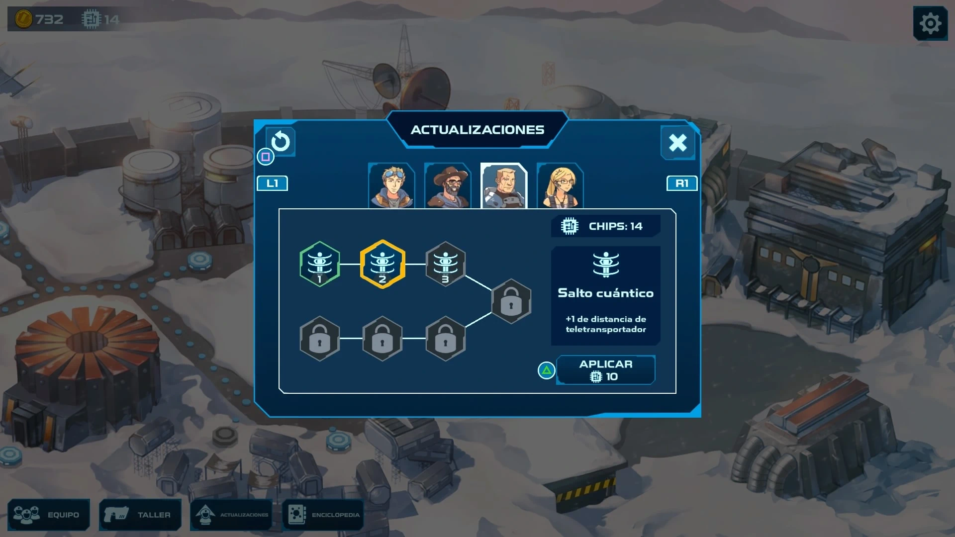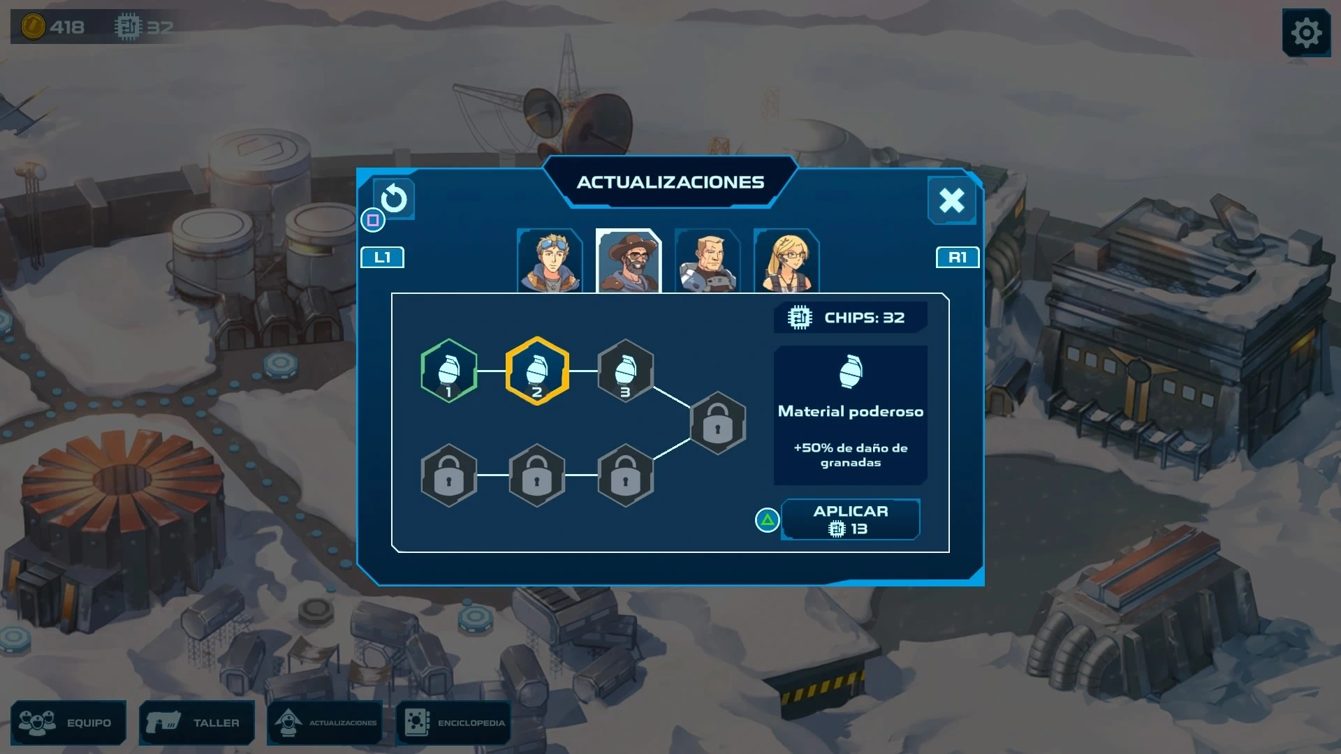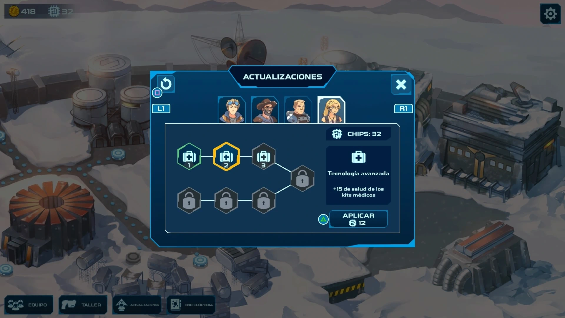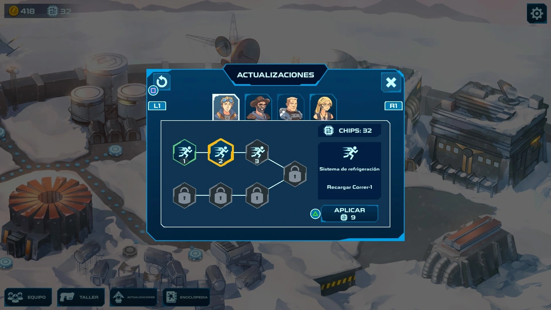 Por otro lado, cada personaje tiene un árbol de habilidades sencillo de dos ramas que permiten mejorar algún aspecto de ese personaje en concreto, la progresión en el árbol de habilidades se realiza mediante los chips obtenidos en las misiones.