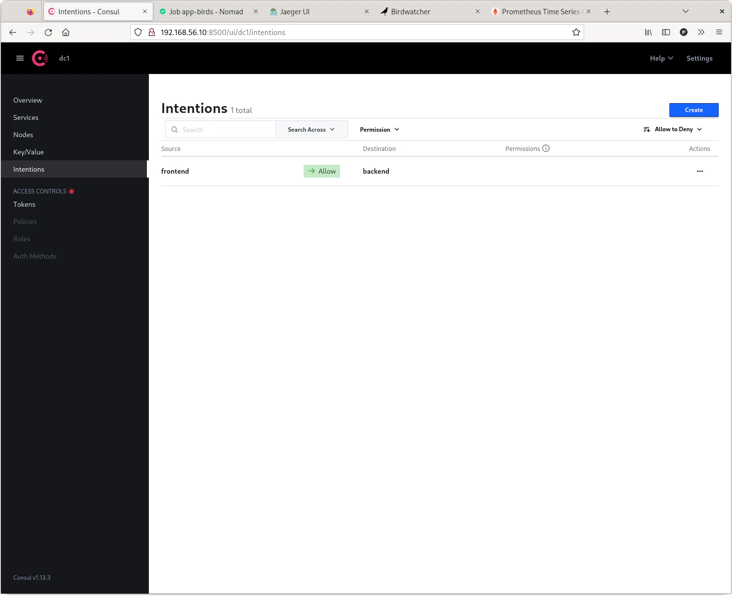 Al arrancar Consul en modo desarrollo el comportamiento por defecto es permitir la comunicación entre los servicios, en una configuración en grado de producción por el contrario por defecto no se permite.