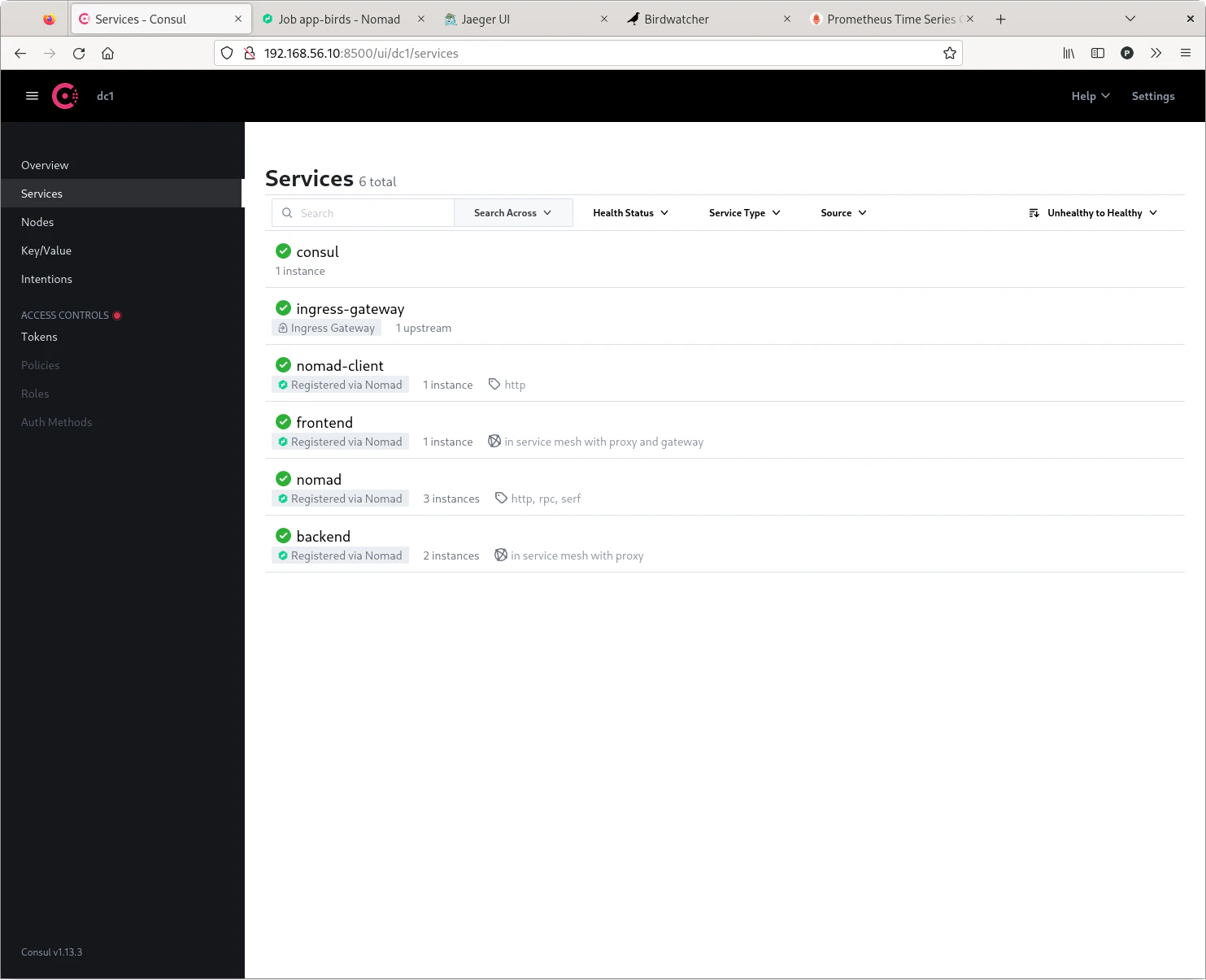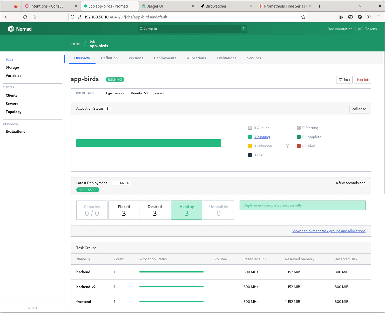 Tanto Consul como Nomad ofrecen una interfaz web para consultar el estado de los servicios y realizar tareas de forma más intuitiva que utilizando la línea de comandos. La interfaz de Consul se inicia en el puerto 8500 y la de Nomad en el puerto 4646 la dirección IP es la de la máquina virtual.