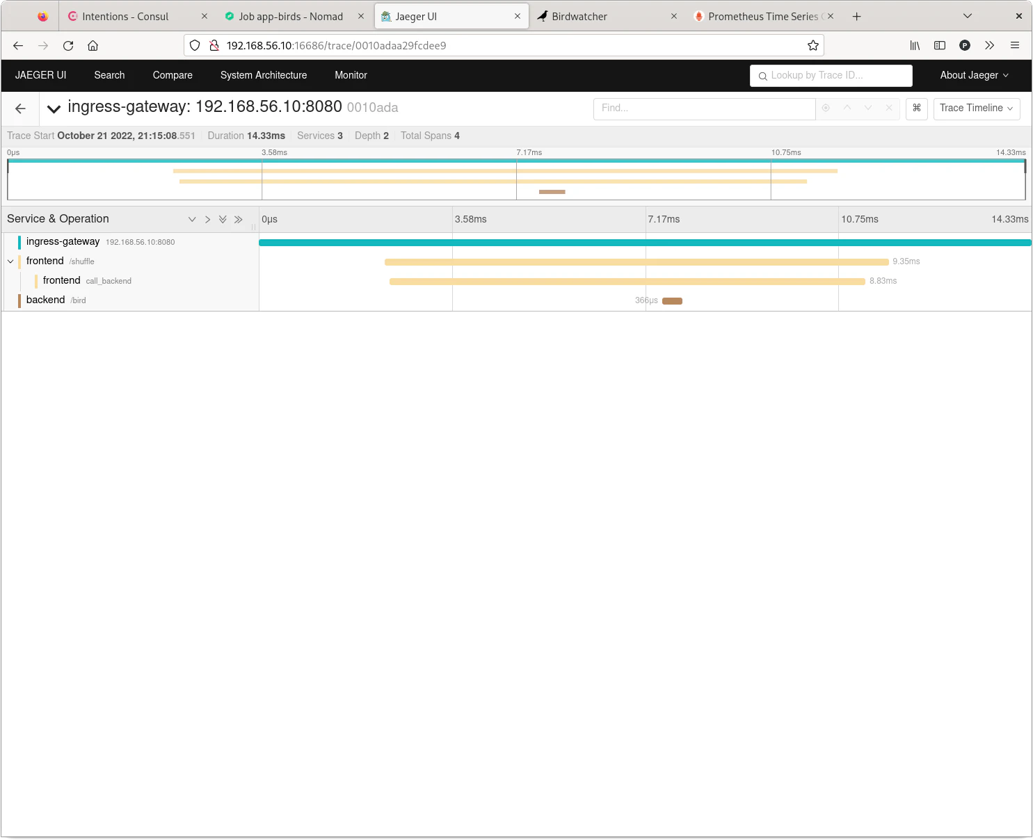 Consul y los sidecar proxy de Envoy ofrecen soporte para trazabilidad con Zipkin junto con cierto soporte de los propios servicios la trazabilidad es enviada a un servidor como Jaeger que permite visualizar y relacionar las llamadas entre los diferentes servicios. Desde que entra por el ingress-gateway hasta que llega al backend pasando por el servicio de frontend asi como el tiempo empleado en cada uno de ellos.