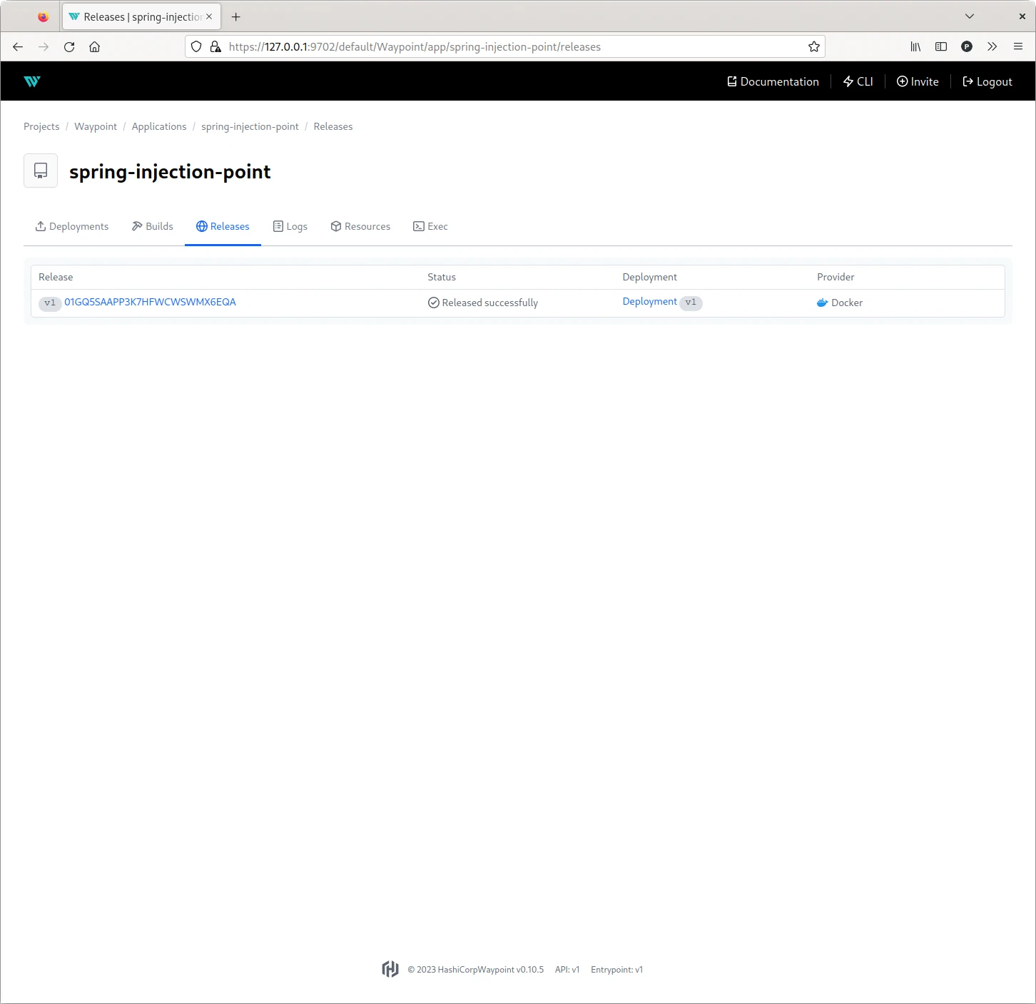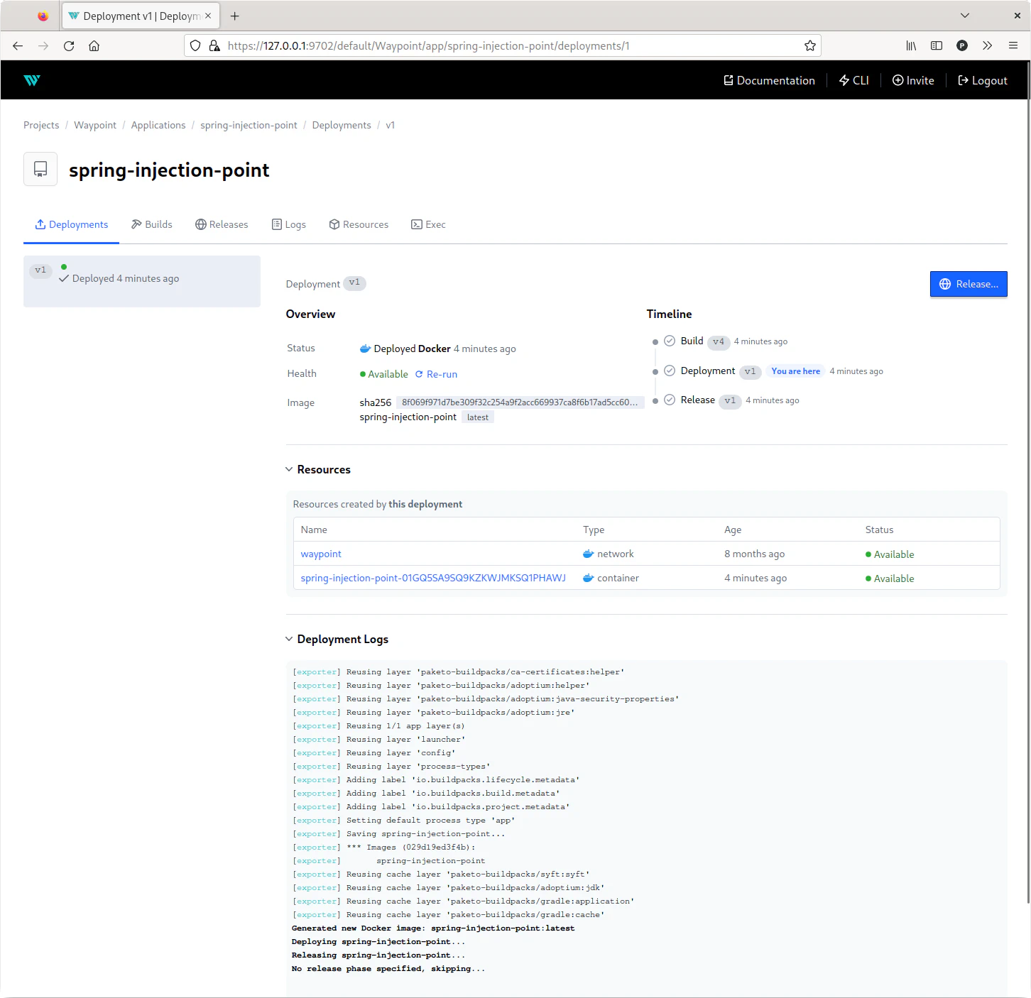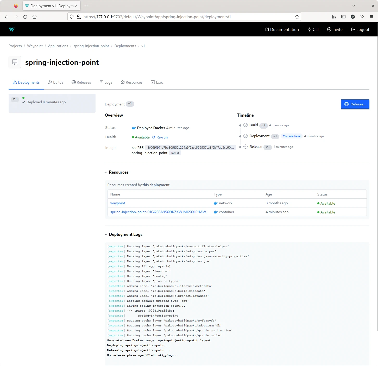 La interfaz web de Waypoint accesible con un navegador ofrece información de los proyectos, builds, deployments y releases además de logs.
