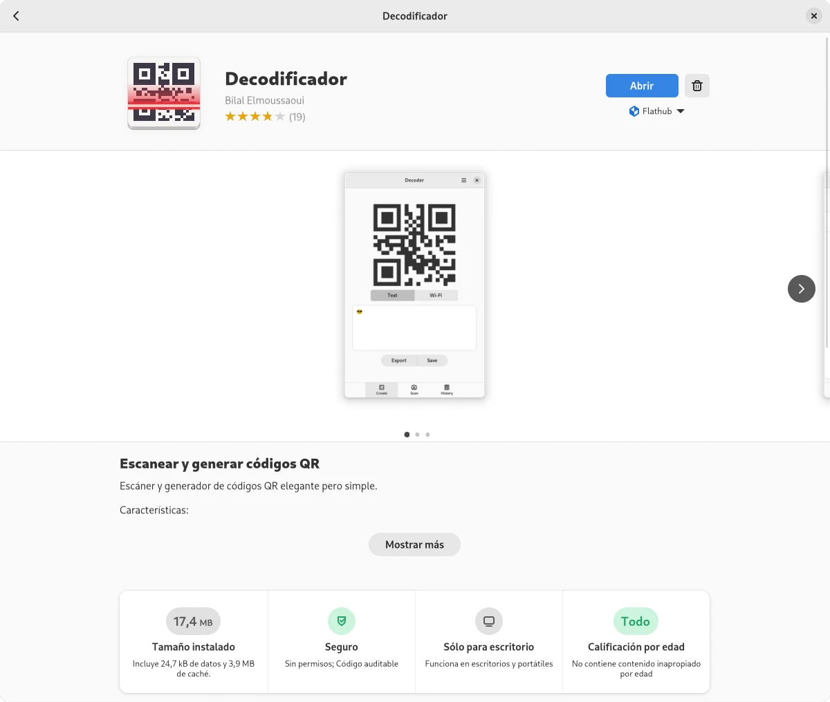 Otra aplicación sencilla para códigos QR es Decodificador, también disponible en GNU/Linux en formato Flatpak muy fácil de instalar. Zink también permite generar códigos QR pero no leerlos, Decodificador permite generar sólo códigos QR pero también leerlos proporcionada la imagen con una captura de imagen desde el ordenador o desde un archivo, sin necesidad de utilizar un móvil.