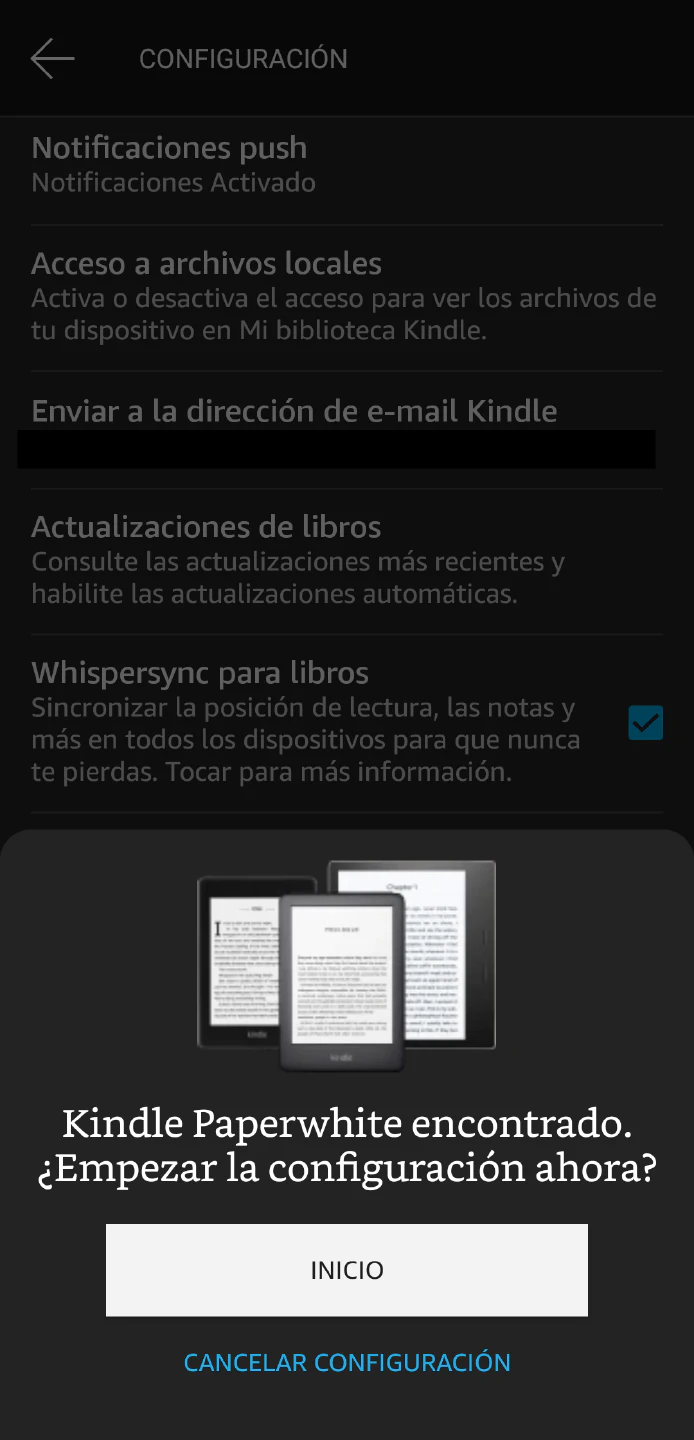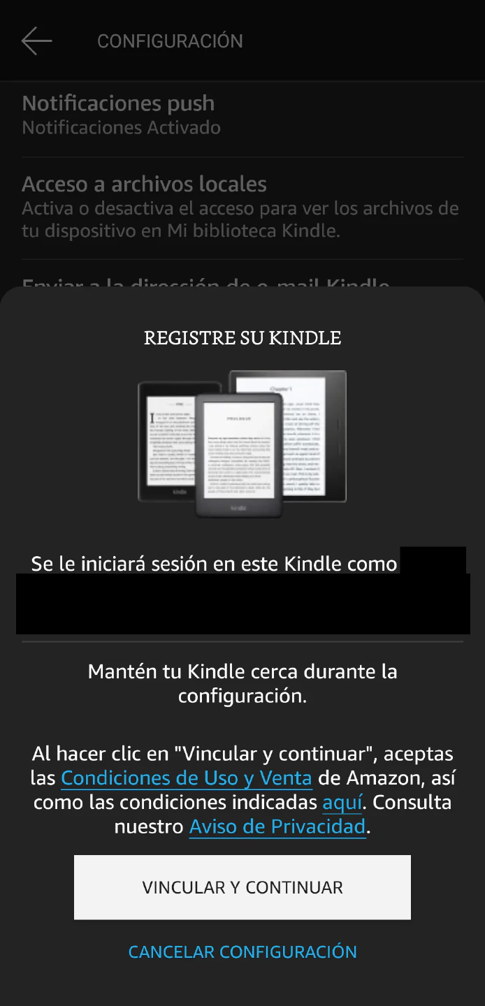 La configuración con la aplicación de móvil de Kindle también debe ser posible y más sencilla sin embargo no conseguí completarla de esta manera.