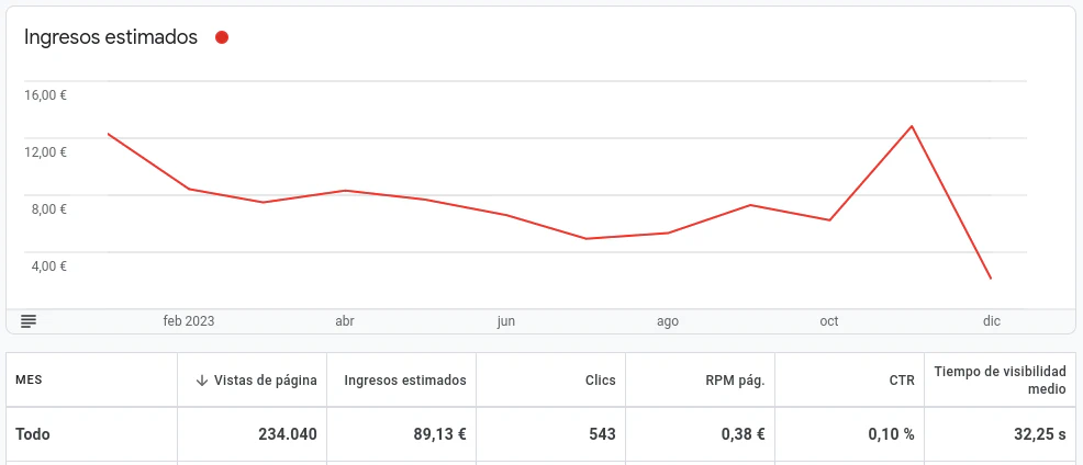 Al igual que las visitas los ingresos se han reducido notablemente ya que ambos en parte están relacionados. Tanto los ingresos de AdSense, Videoo y Amazon así como de artículos patrocinados se han caído respecto a años anteriores. En los mejores años por AdSense este blog ha generado unos 450 € y ahora no llega a 90 €, eso sí ahora escribiendo y dedicándole mucho menos tiempo.
