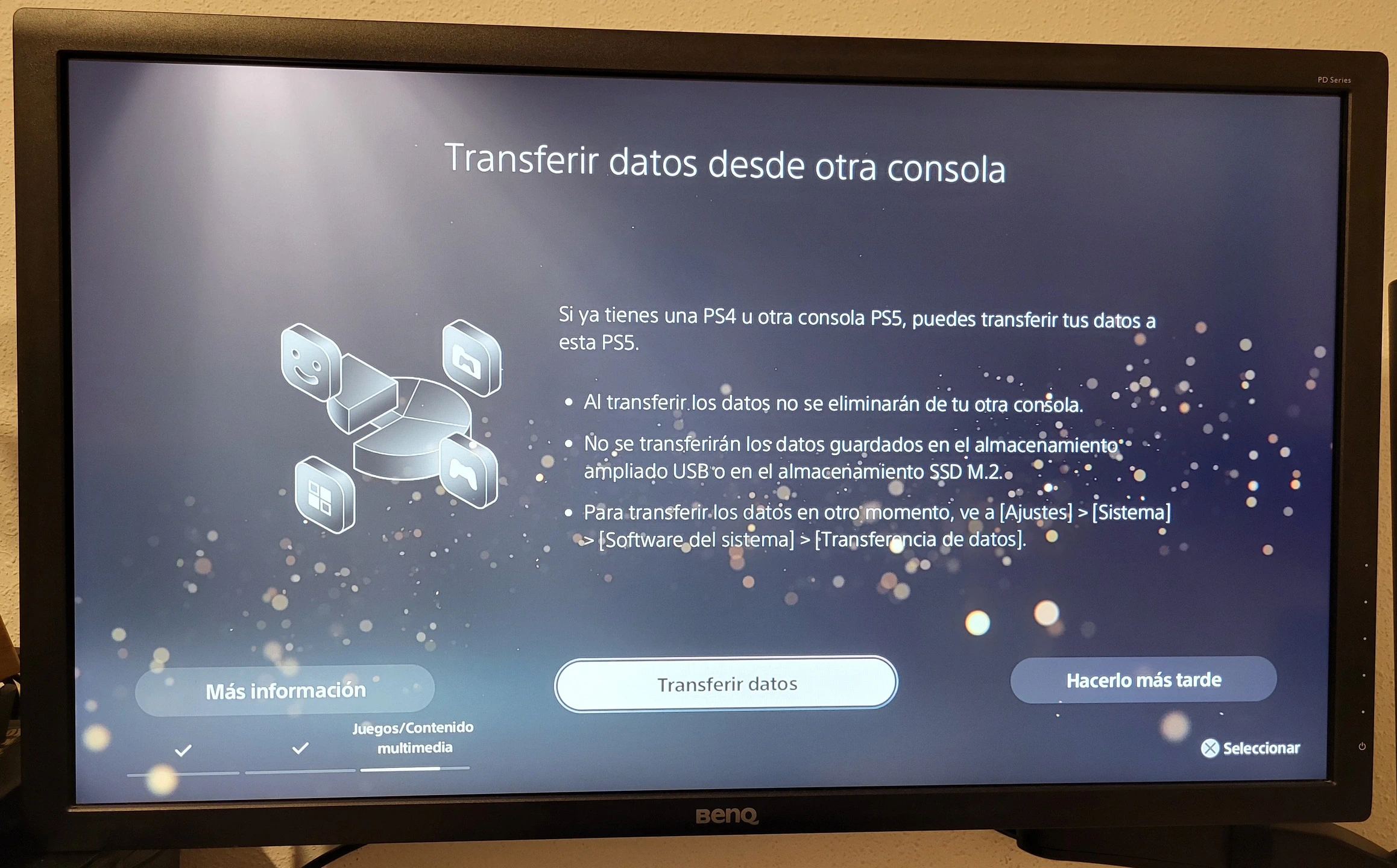 Muchos usuarios migrarán de la PS4 a la PS5 y para no perder los datos de partidas guardadas hay que realizar una transferencia. En teoría se puede hacer conectando las dos consolas a la misma red o router pero a mi al hacer la operación no me detectaba la PS4. Como alternativa la transferencia se puede hacer mediante una unidad USB que consiste en guardar los datos de los juegos en el almacenamiento externo, en la PS4 en la opción Settings > Application Saved Data Management > Saved Data in System Storage > Copy to USB Storage Device, y copiarlos al PS5 en la opción Settings > Saved Data and Game/App Settings. La transferencia de datos es importante para mantener el progreso de los juegos.