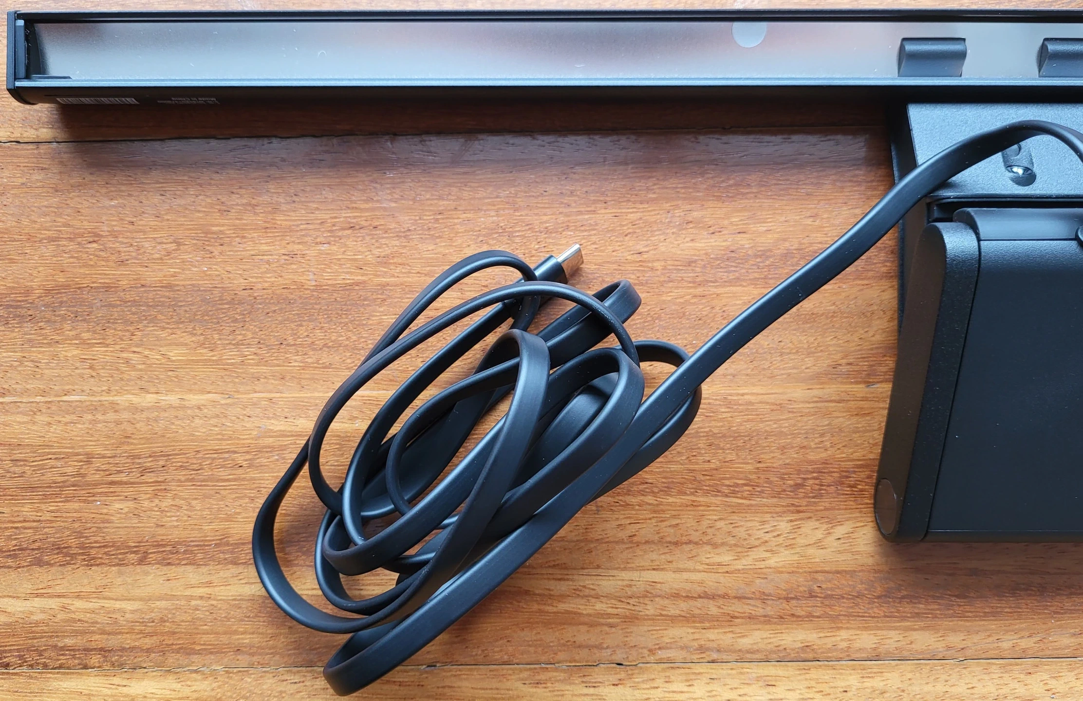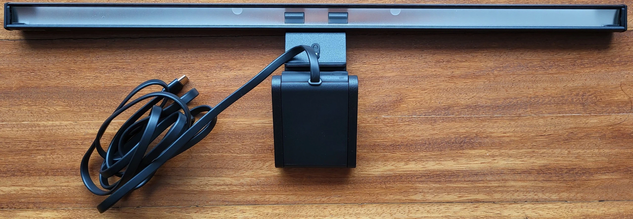 El contenido se compone de la barra de luz, un adaptador de corriente y un par de hojas de instrucciones. El cable no es desconectable de la barra de luz, es plano y es bastante largo lo que es importante al ser no desconectable, su longitud es más que suficiente para llegar al enchufe en una mesa de oficina o a uno de los puertos del ordenador.