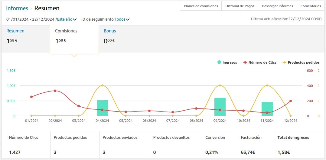 Los ingresos por publicidad de afiliado por Amazon también se han reducido y mucho, significativamente menos que en años anteriores. No llega a 2 €… al año.