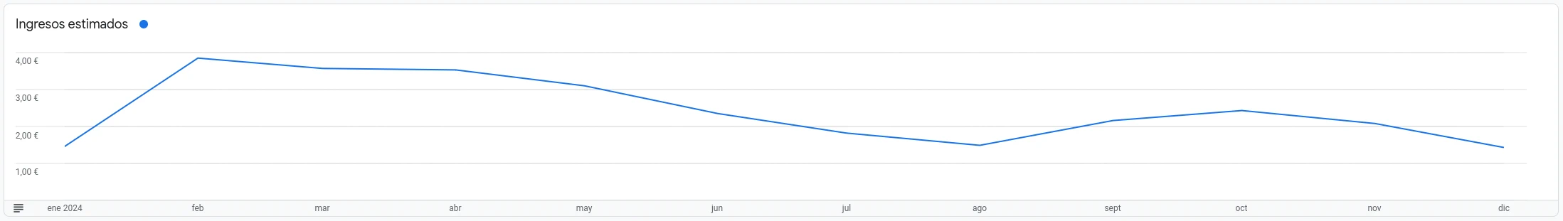 Ya no publico tantos artículos, aunque no solo por eso los ingresos de Google AdSense como ya comentaba se han seguido reduciendo y ya por poco supera los ingresos de 1 € al mes por Google AdSense. Quizá pensaba que después de la pandemia se recuperaría pero desde entonces no ha hecho que incluso ir a peor. Este año ha sido uno en el que no he recibido ingreso por publicidad por no haber alcanzado el mínimo de 70 €.