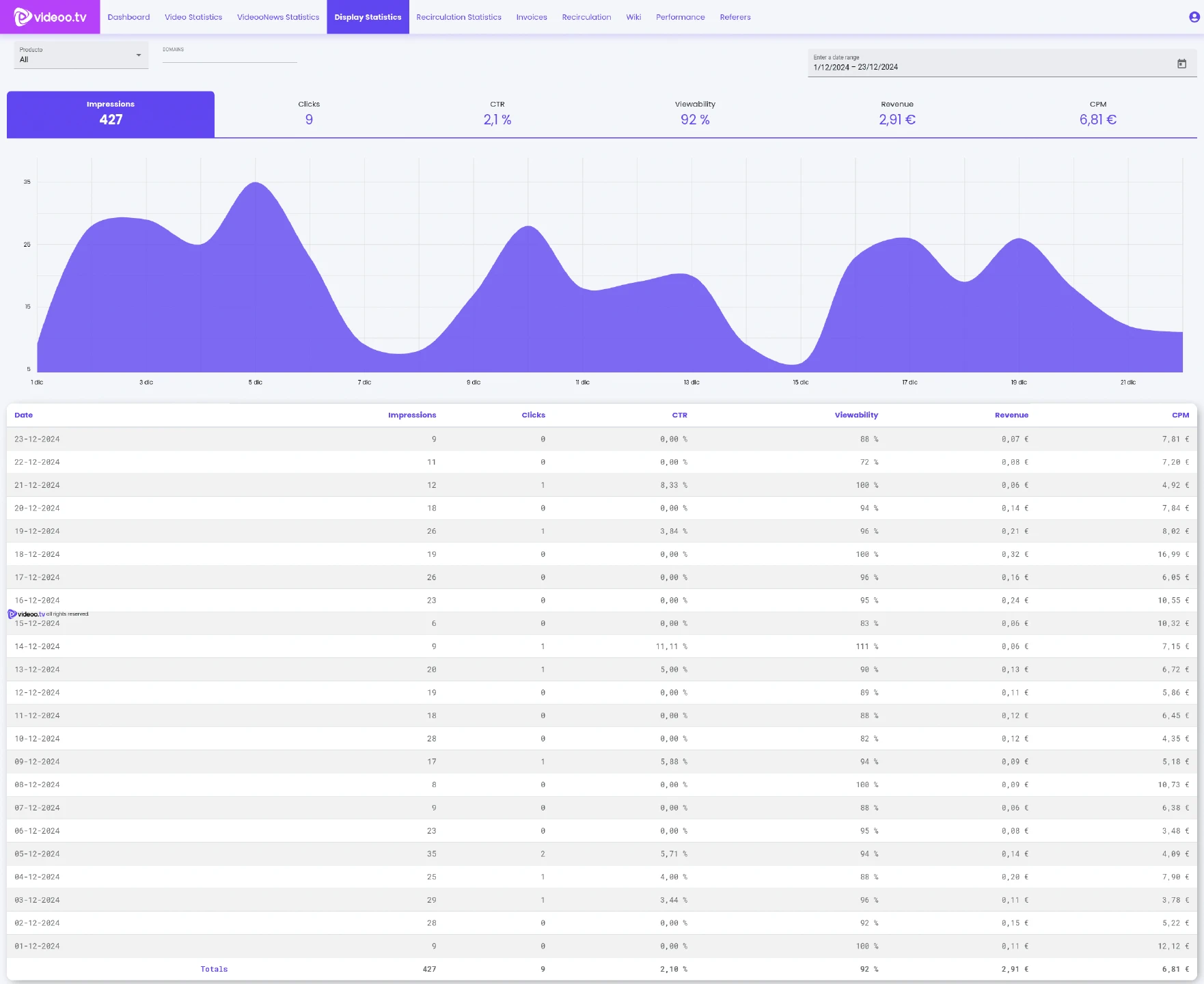 Los ingresos por publicidad de videoo.tv son algo mejores pero al tener menos visitas también no son algo que compense el trabajo que supone. La publicidad de Videoo.tv, que al entrar al artículo, es más molesta pero no nada distinto a lo que hace YouTube al empezar a ver un vídeo con su publicidad in-stream. Ofrece un muy buen CPM aunque en mi blog con las visitas que tiene los ingresos son simplemente de unos pocos céntimos al día. Al mes no suele llegar a más de 5 €.