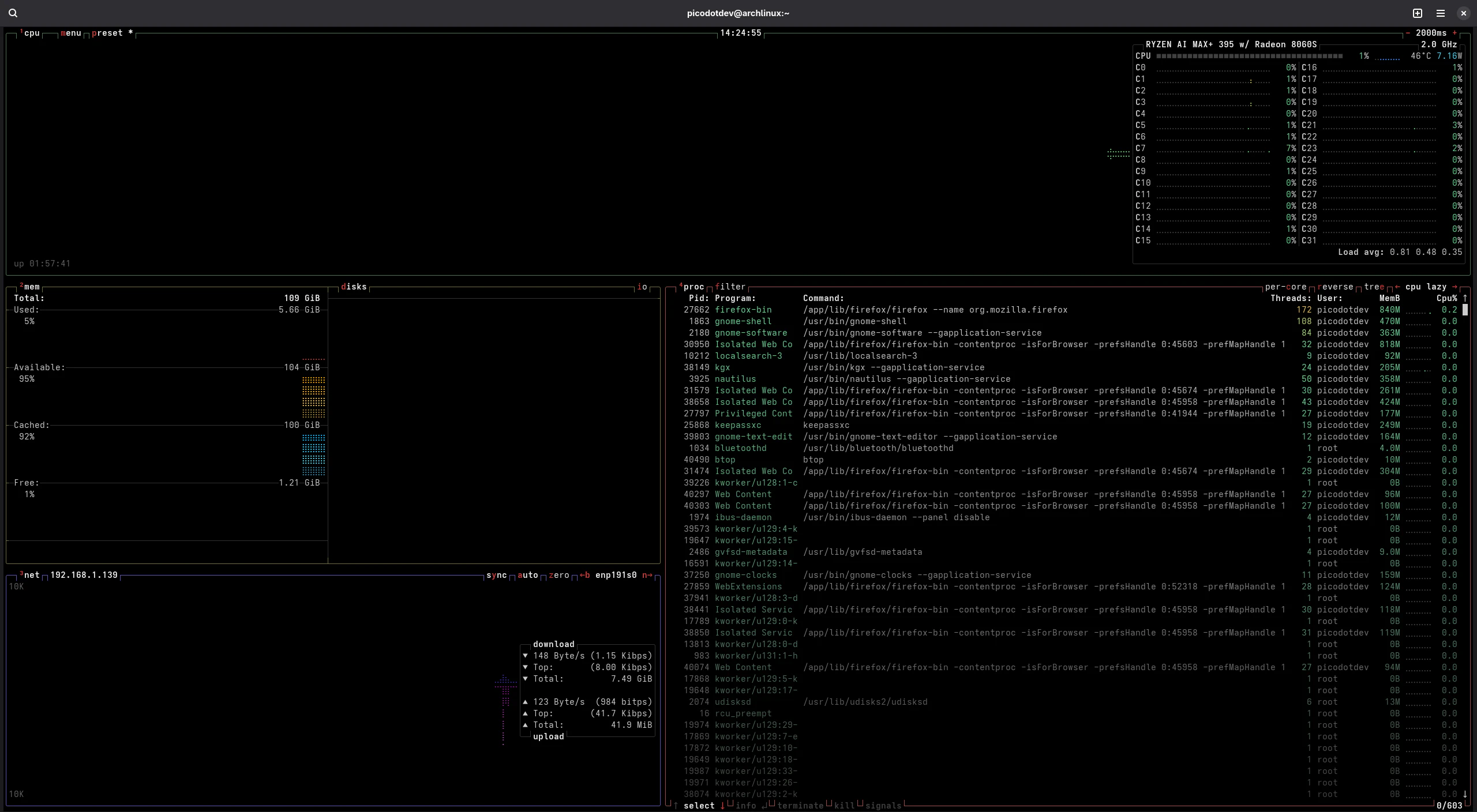 Unos detalles que echo de menos es que tenga una luz que indique la actividad de las unidades de almacenamiento, para suplir su cartencia he instalado una extensión de GNOME que entre otras cosas muestra información de la CPU, memoria, red y temeperaturas.