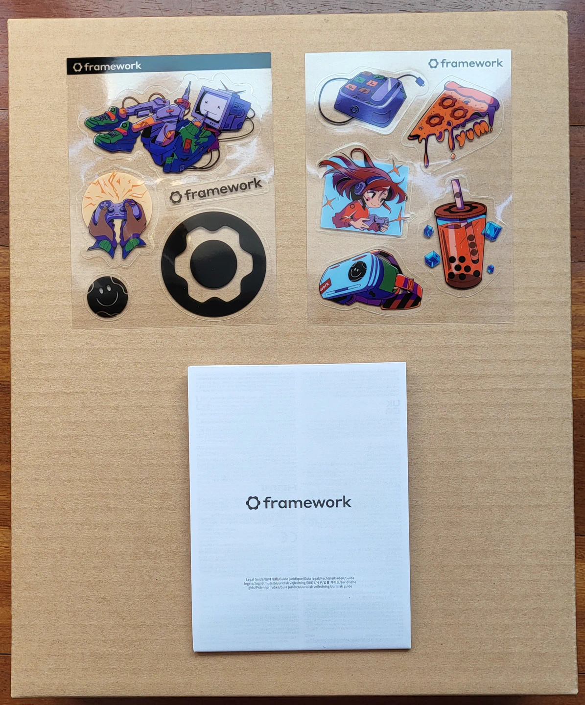 Framework a forma de cortesía y sorpresa incluye varias pegatinas para personalizar el equipo y que sea único, no se si las colocaré.