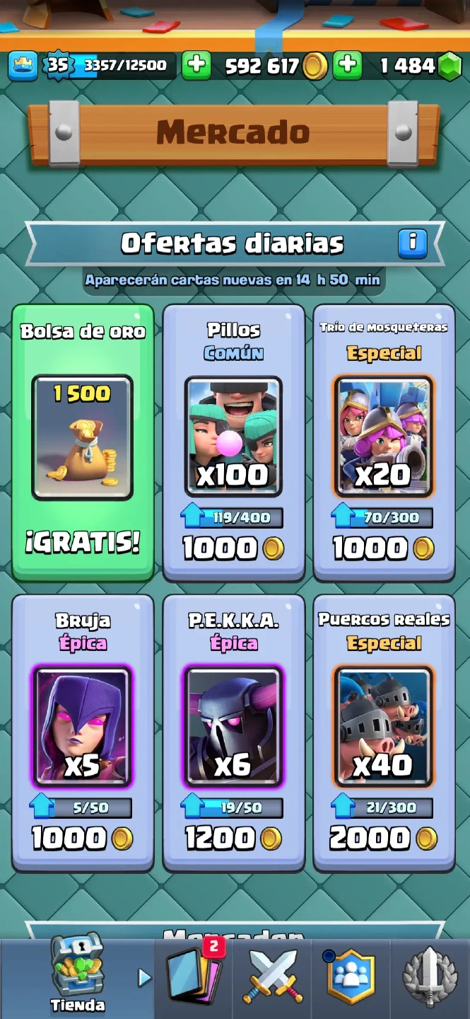Para que pases por la tienda todos los días hay una sección en la que dan cada día oro o unas pocas cartas aleatorias a cambio de oro o gemas.